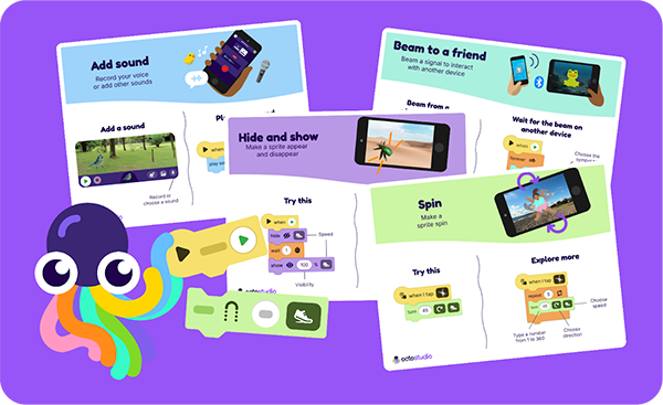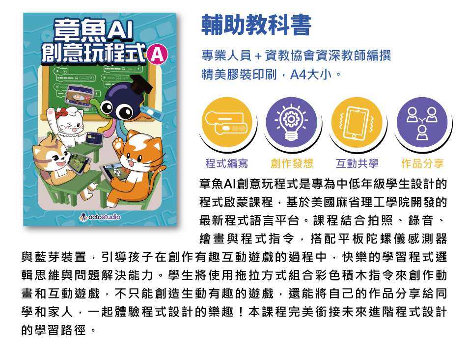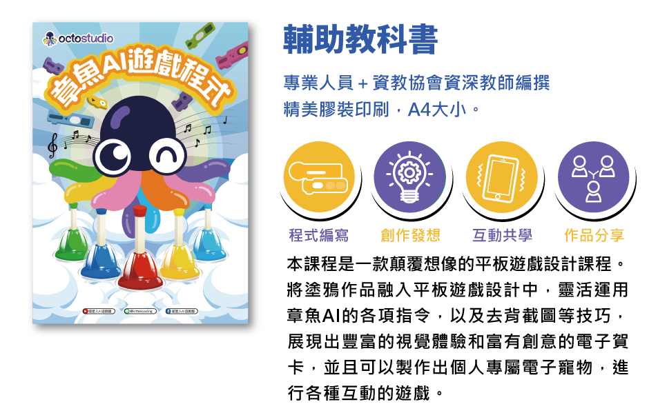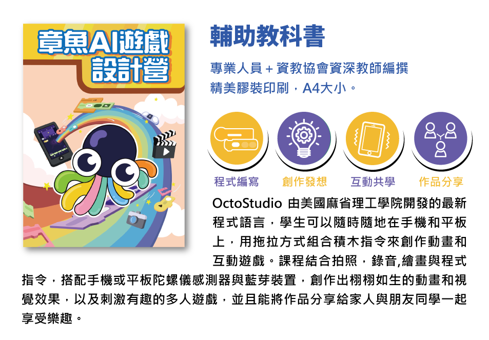社團法人台灣資訊教育發展協會針對 OctoStudio APP,聘請專家研發一套結合遊戲、故事的教學模式及教材,配合專業師資的指導,從課程中學到邏輯力及解決問題能力,設計自己的電腦遊戲!