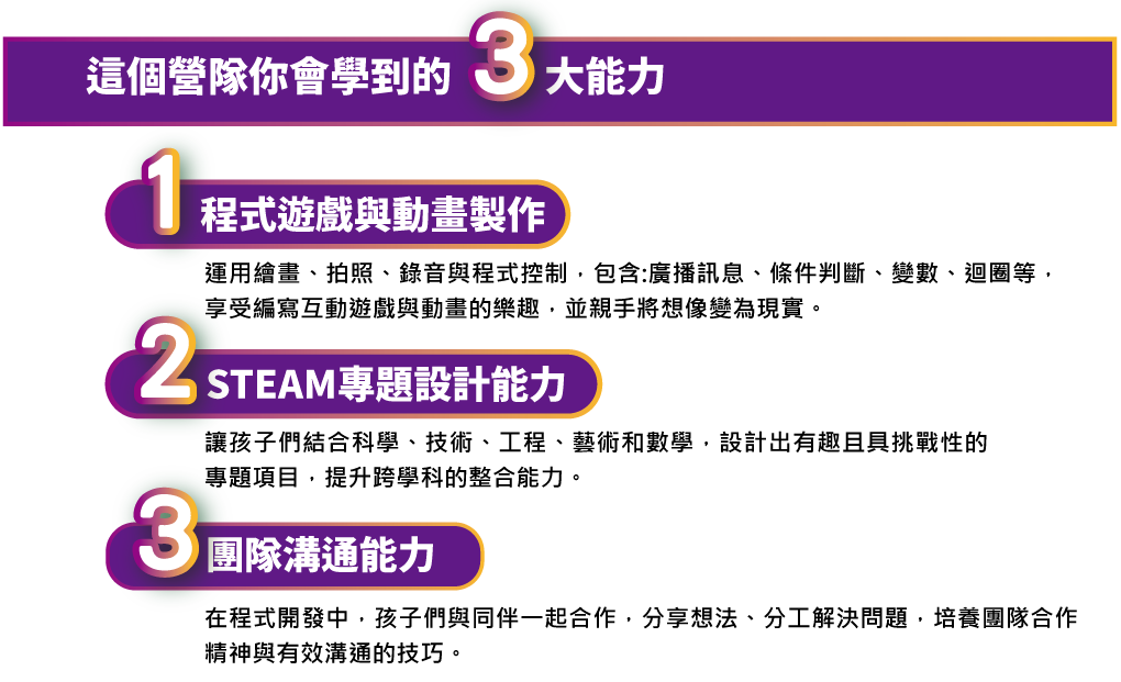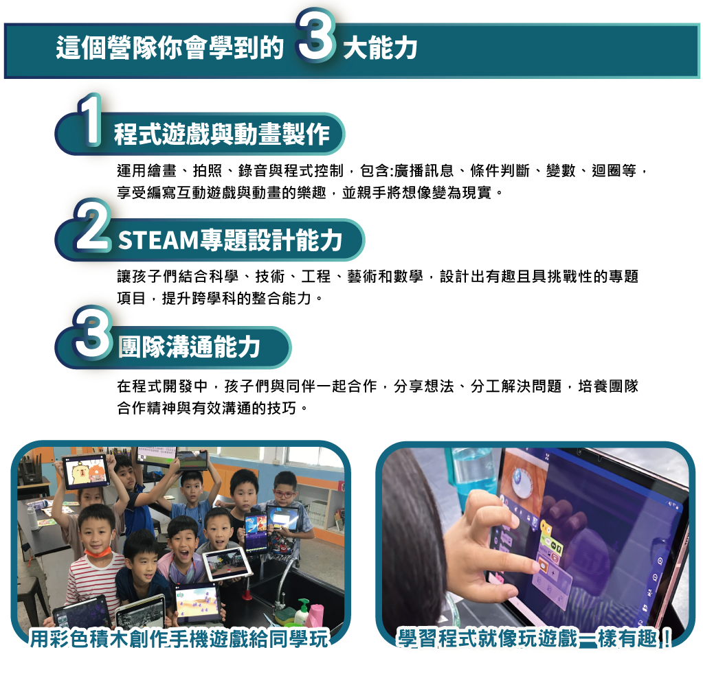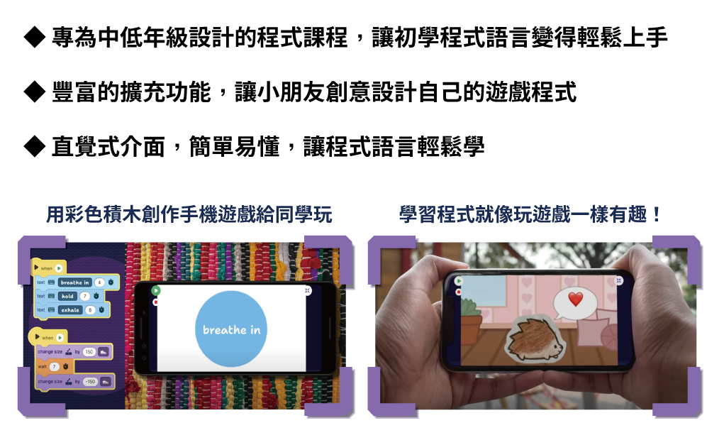 由美國麻省理工學院開發的最新程式語言,學生可以隨時隨地在手機和平板上,用拖拉方式組合積木指令來創造動畫和互動遊戲。課程結合拍照、錄音、繪畫與多種程式指令,搭配手機或平板陀螺儀感測器與藍芽裝置,創建出栩栩如生的動畫和視覺效果,以及刺激趣味的多人遊戲,並且能將作品分享給家人與朋友、同學一起享受樂趣。