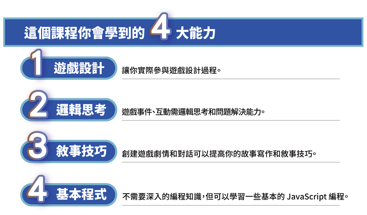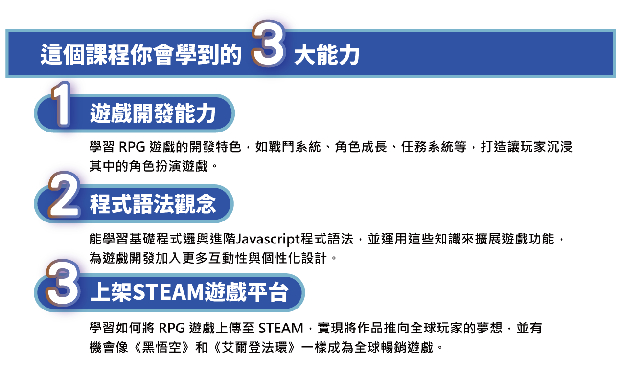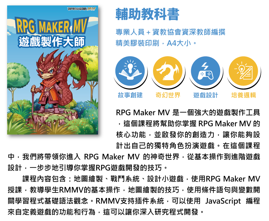 RPG Maker MV課程將幫助你掌握RPG Maker MV的核心功能並啟發你的創造力。由基礎到高階,涵蓋地圖、戰鬥、小遊戲設計,以RPG Maker MV進行實際操作教學,學習基本操作、地圖技巧、條件語句和變數開關的程式基礎。RMMV支持插件系統,使用JavaScript編程來自定義遊戲的功能和行為,這可以讓你深入研究程式開發,設計出自己的獨特角色扮演遊戲。